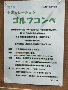 お知らせ 2025.12.25 注目!!第7回シミュレーションゴルフコンペ開催のお知らせ 皆様 おまたせいたしました。 本日12/25から恒例のシミュレーションゴルフコンペ開催です。 今回は熊本空港CCになります。参加費用無料ですので奮ってご参加下さい。 日頃の練習の成果を試す時です。参加賞もご用意してますのでご期待ください。 コンペ詳細、参加方法などは、スタッフにお気軽にお尋ねいただくか、店舗カウンター横の掲示板に張り出してあります。 皆様の参加お待ちしております。 swing24/7 保土ヶ谷店